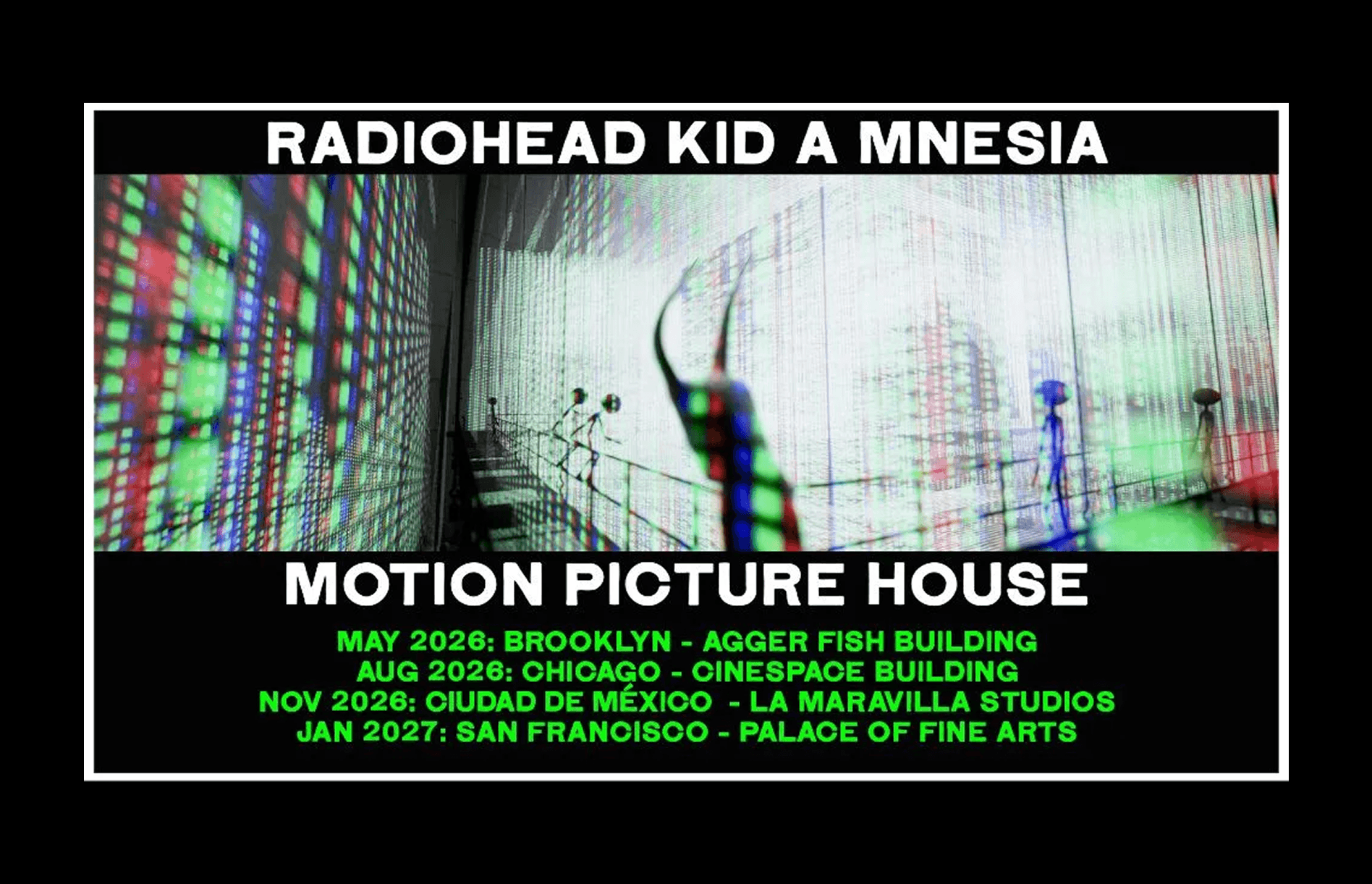 “Fans will recall the KID A MNESIA exhibition directed by Sean Evans and featured on Epic Games Store and PS5, aptly described by The Verge as “unsettling and beautiful.” KID A MNESIA was originally intended as an experience in a physical space, and while the pandemic necessitated Epic Games’ Unreal Engine transporting the project to a virtual world, Motion Picture House is the actualization of the original idea: an opportunity for audiences to be completely enveloped in the world of Kid A and Amnesiac. In the flesh, on a large scale and featuring a custom-built 6-point surround system for which the music was specifically remixed, KID A MNESIA features a narrative designed by its creators — in Thom Yorke’s words — 'in which a Monster is trapped in a derelict museum of the lost & forgotten.'"