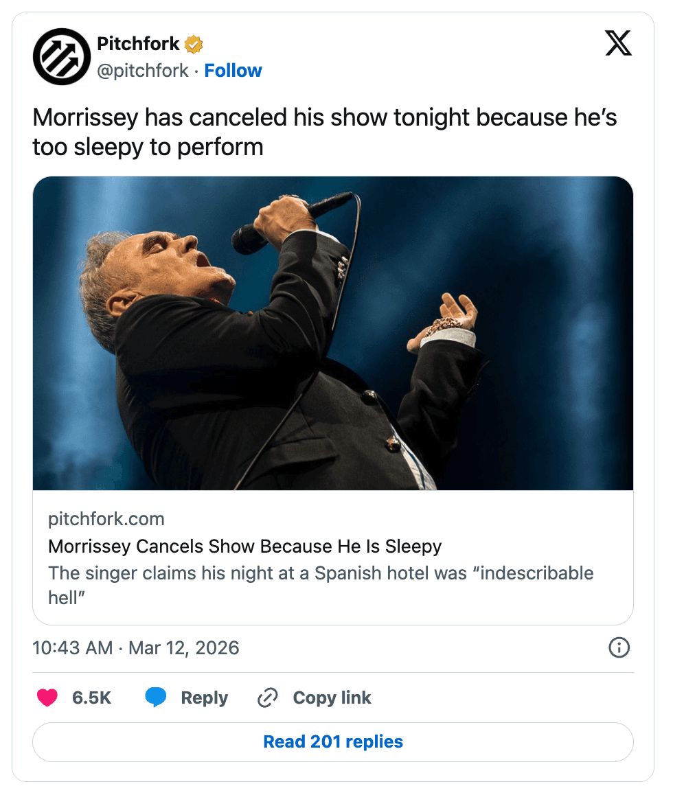 With a 24% cancellation rate, you can now track how many shows Morrissey has cancelled across his career; he most recently ended his show in Spain early due to lack of sleep leaving him in a "catatonic state"